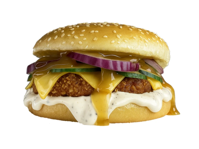 Булочка с кунжутом, соус цезарь, лук красный маринованный, отбивная куриная в панировке, сыр чеддер, огурец, соус кисло-сладкий