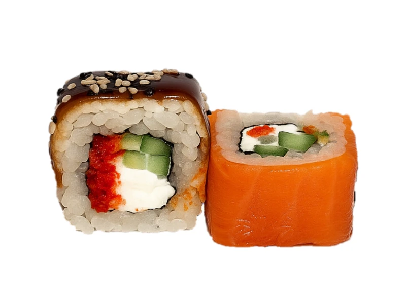 Рис, нори, лосось, угорь, огурец, икра тобико, сливочный сыр, кунжут, соус унаги