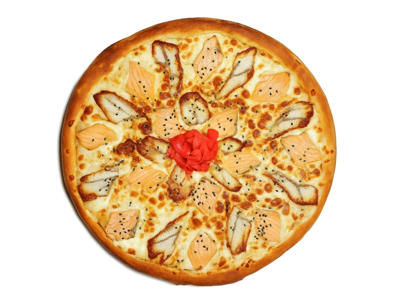 тесто, соус спайси, моцарелла, лосось, копченый угорь, кунжут, имбирь